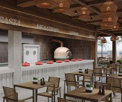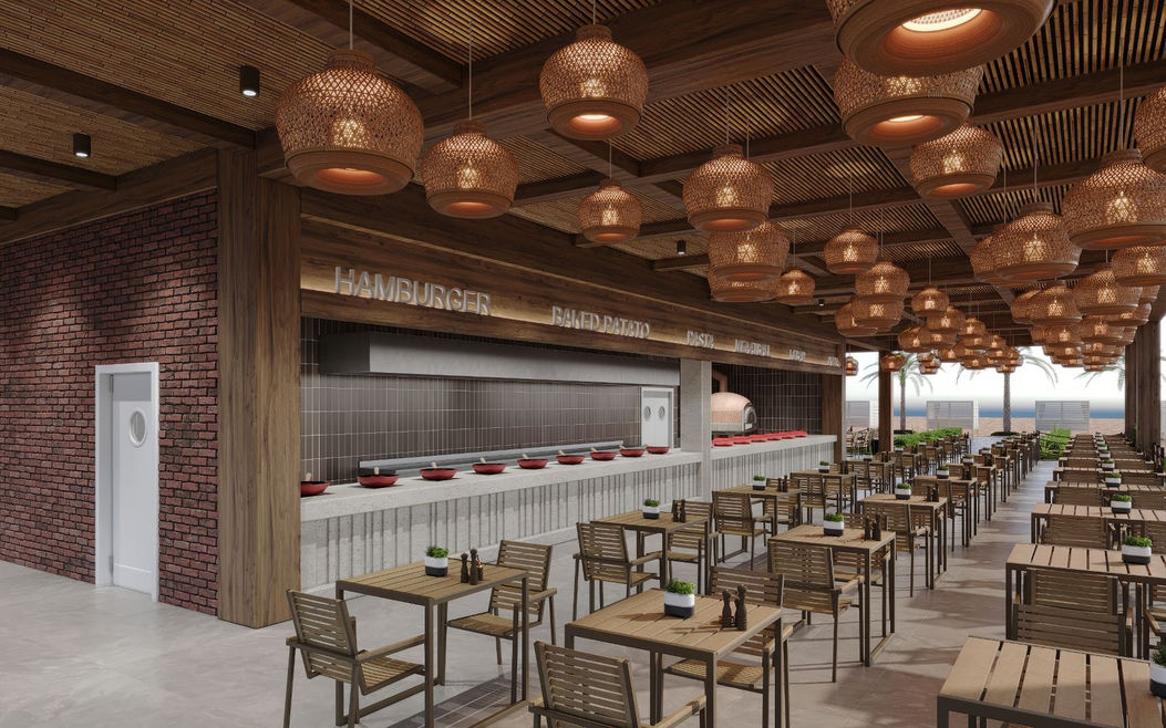 Green Nature Hotel için tasarladığımız sahil snack alanında; doğal ahşap, tuğla ve hasır gibi sıcak malzemeleri bir araya getirerek doğayla uyumlu, samimi bir atmosfer oluşturduk. İki yandan merdivenle çıkılan geniş terasta oturma alanları, açık büfe ve bar bölümü yer alıyor. Bar, gün boyunca misafirlere serinletici içecekler sunarken, akşam saatlerinde amfi tiyatro etkinliklerine entegre bir şekilde hizmet veriyor.